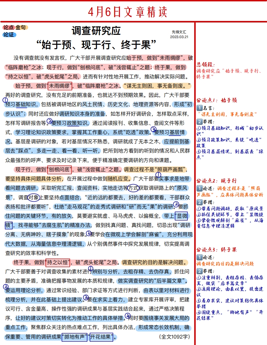 2023年人民日报精读20230406 调查研究应 “始于预、现于行、终于果”(20230321)