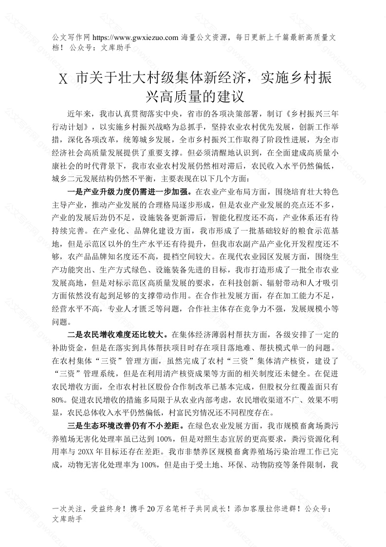 X市关于壮大村级集体新经济,实施乡村振兴高质量的建议