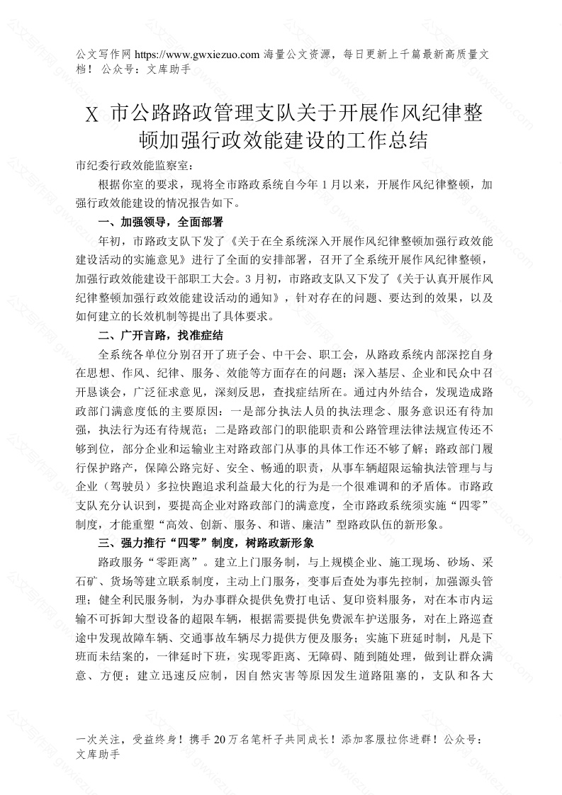 首页学习提升X市公路路政管理支队关于开展作风纪律整顿加强行政效能建设的工作总结