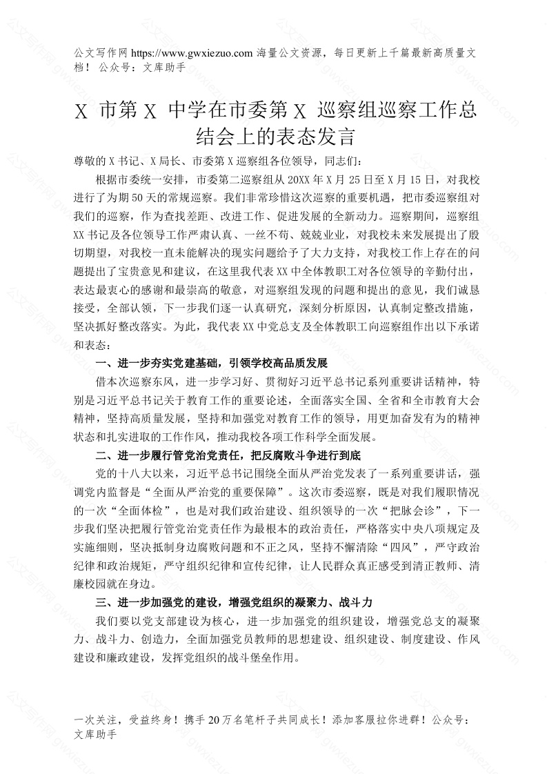 X市第X中学在市委第X巡察组巡察工作总结会上的表态发言