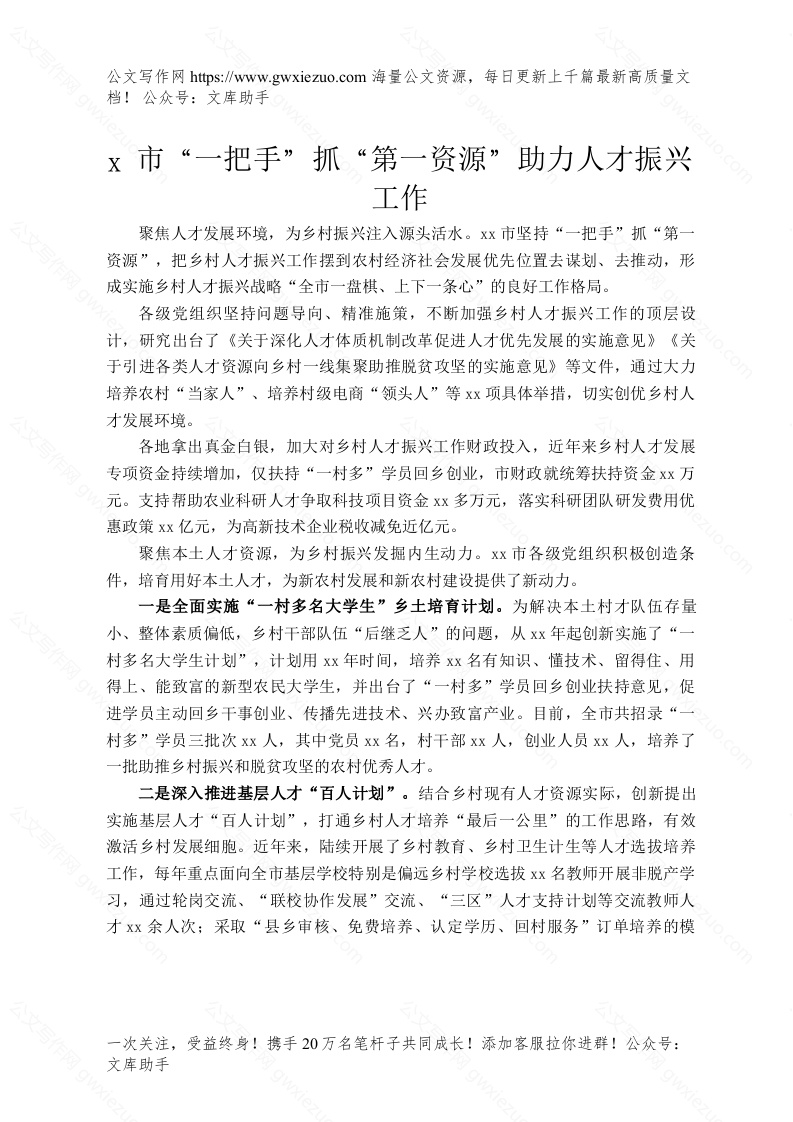 x市“一把手”抓“第一资源”助力人才振兴工作