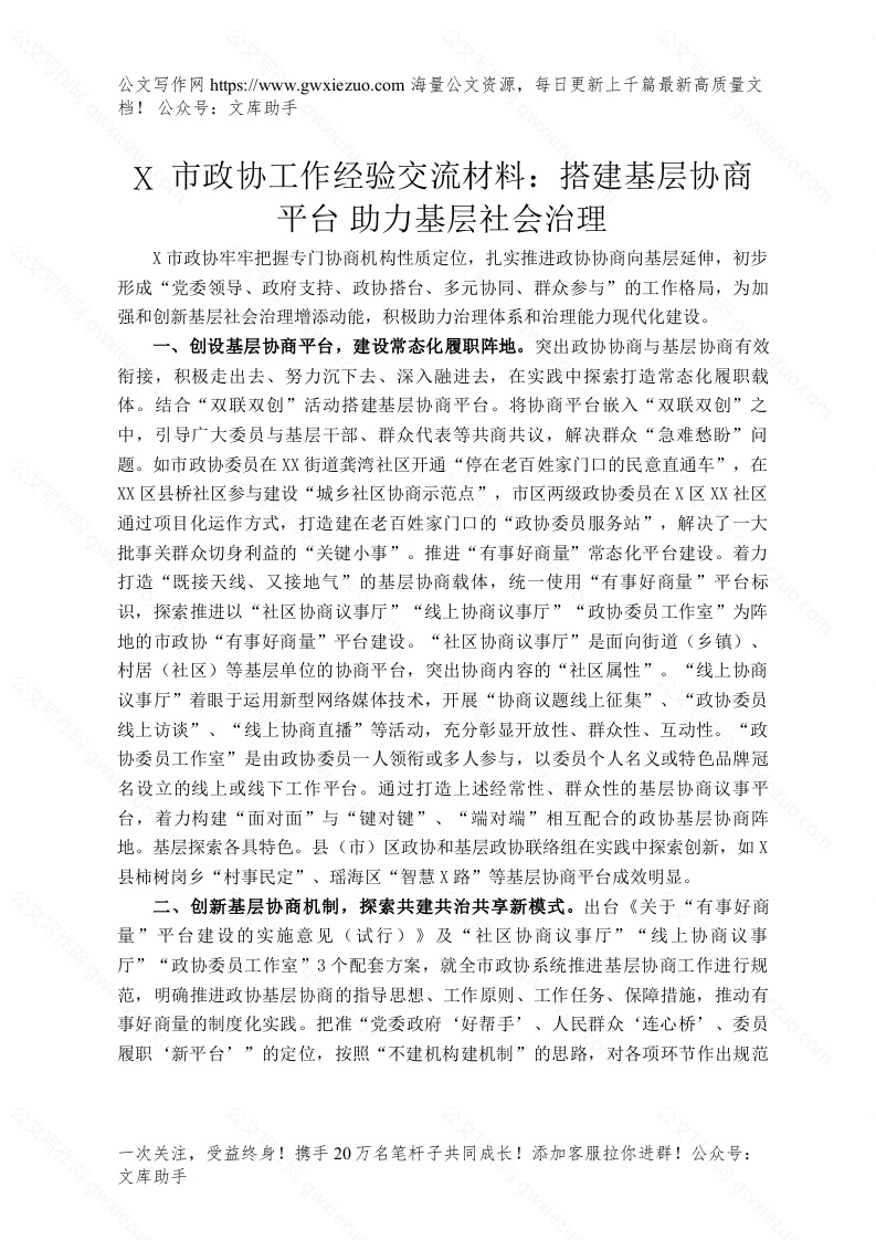 X市政协工作经验交流材料:搭建基层协商平台 助力基层社会治理