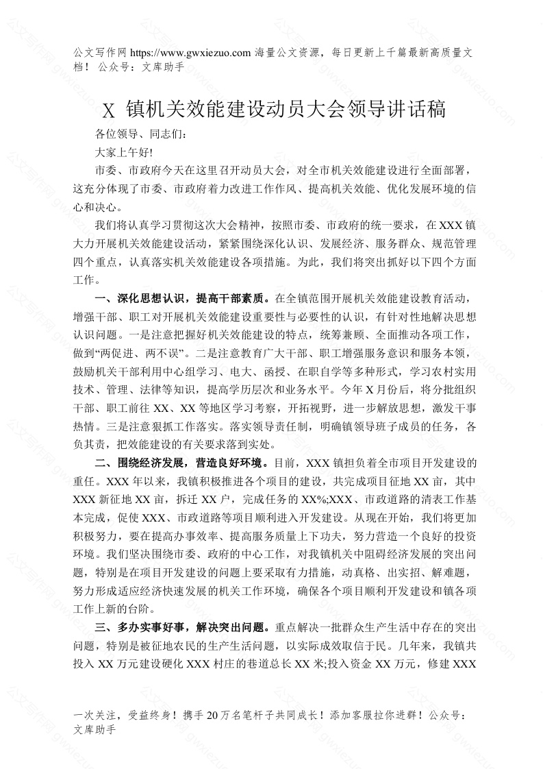 首页工作文档X镇机关效能建设动员大会领导讲话稿