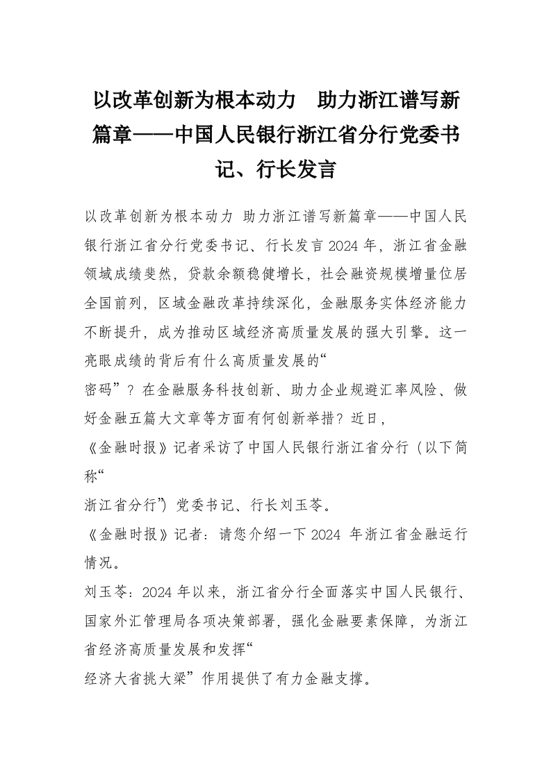 以改革创新为根本动力 助力浙江谱写新篇章——中国人民银行浙江省分行党委书记、行长发言