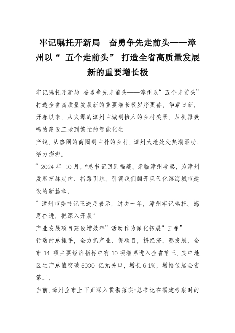 牢记嘱托开新局 奋勇争先走前头——漳州以“ 五个走前头” 打造全省高质量发展新的重要增长极