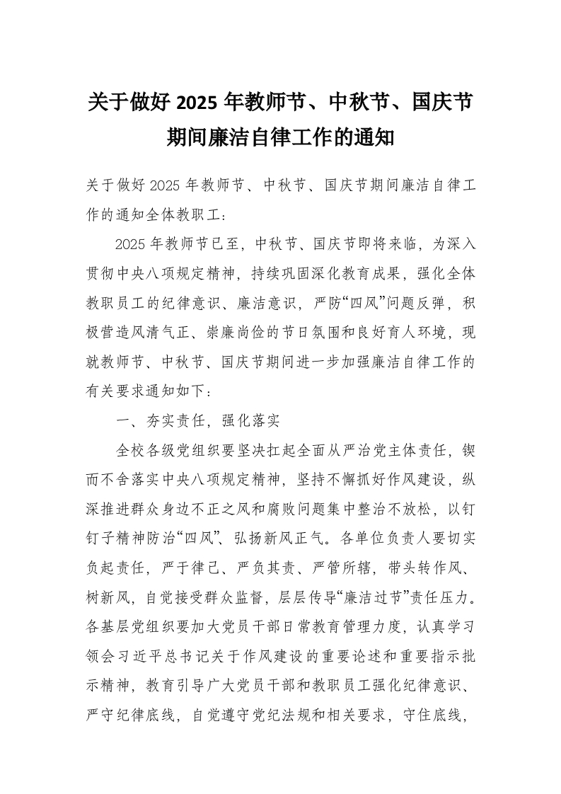 关于做好2025年教师节、中秋节、国庆节期间廉洁自律工作的通知