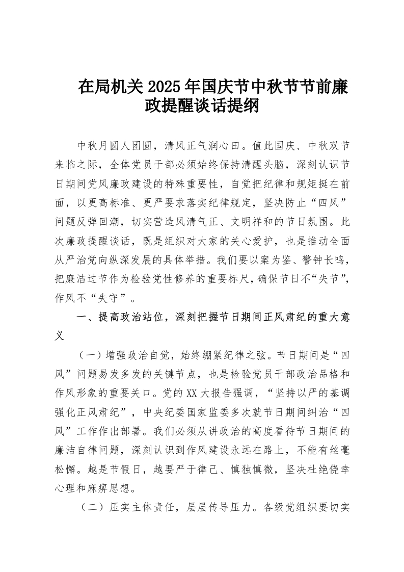 在局机关2025年国庆节中秋节节前廉政提醒谈话提纲