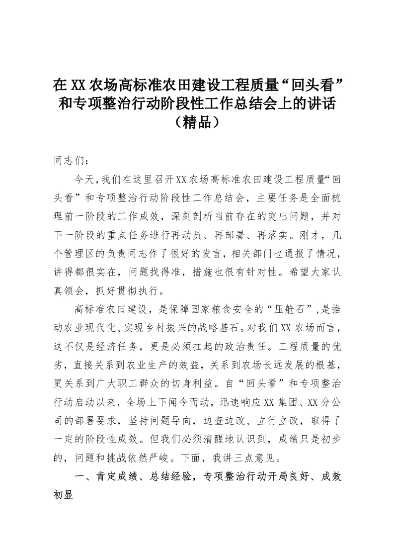 首页精选范文在XX农场高标准农田建设工程质量“回头看”和专项整治行动阶段性工作总结会上的讲话(精品)