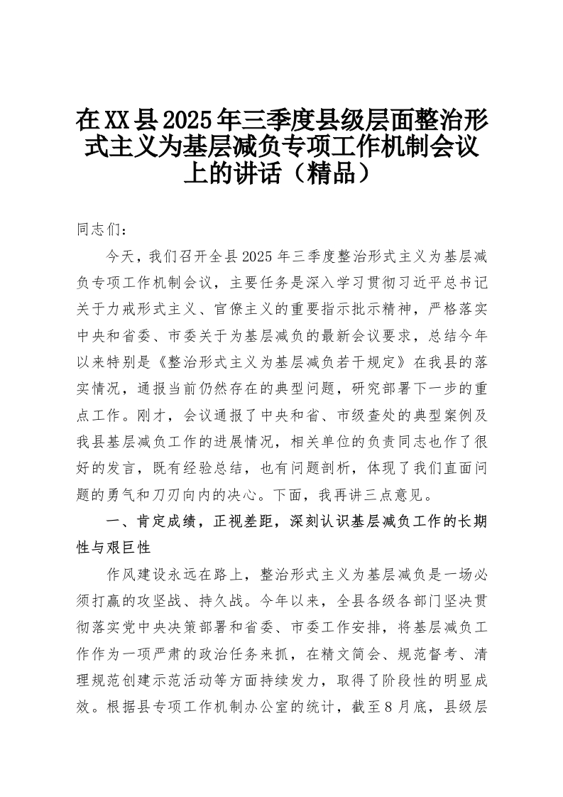 首页精选范文在XX县2025年三季度县级层面整治形式主义为基层减负专项工作机制会议上的讲话(精品)