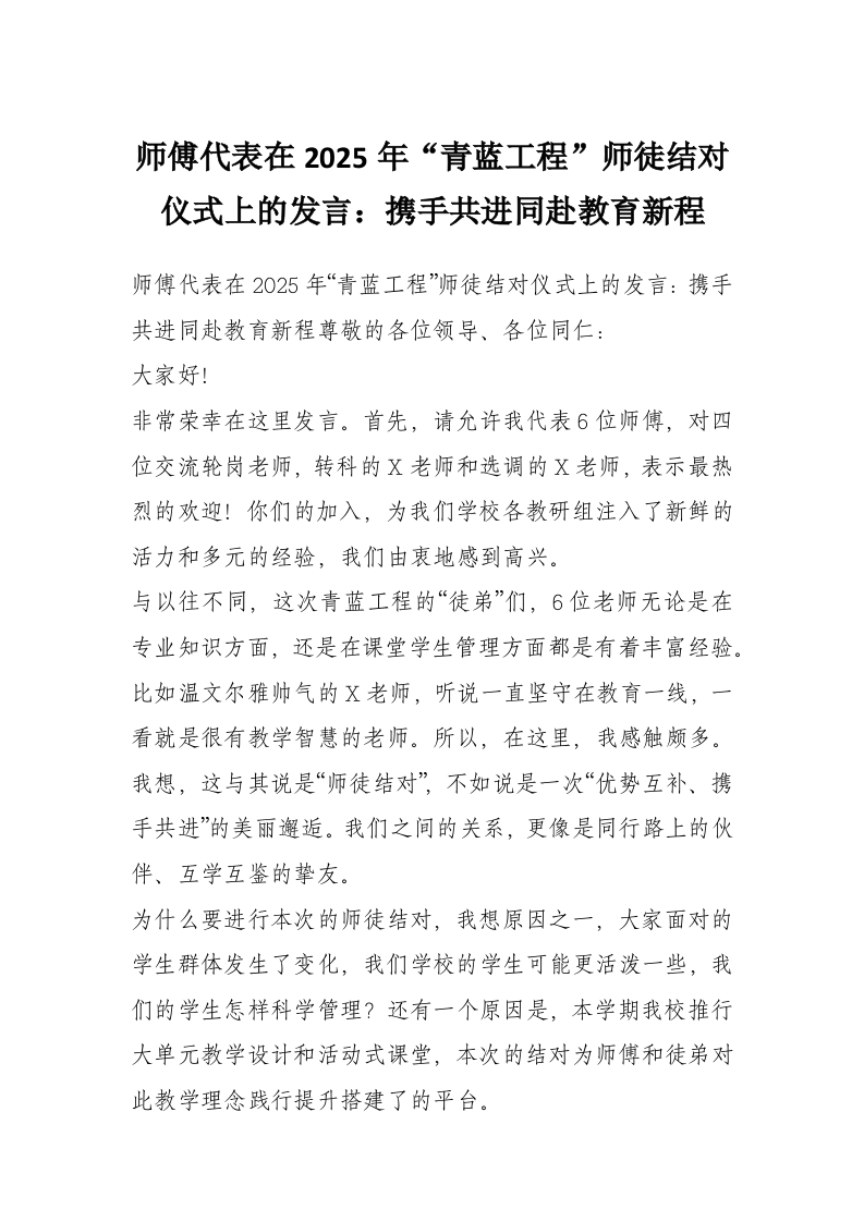 师傅代表在2025年“青蓝工程”师徒结对仪式上的发言:携手共进同赴教育新程