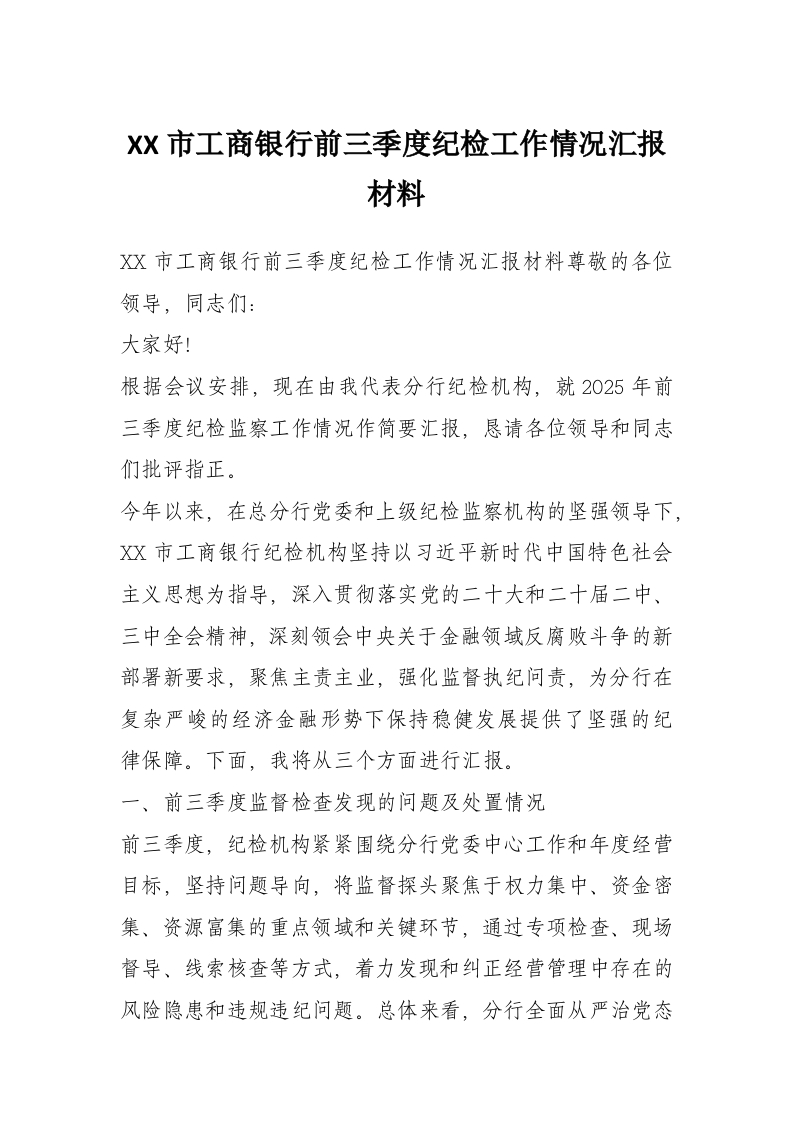 首页写作素材XX市工商银行前三季度纪检工作情况汇报材料