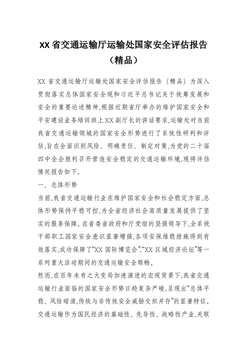 首页写作素材XX省交通运输厅运输处国家安全评估报告(精品)