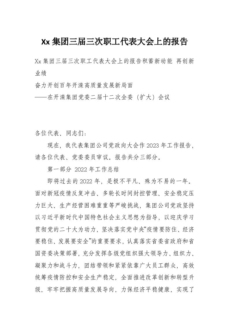 Xx集团三届三次职工代表大会上的报告