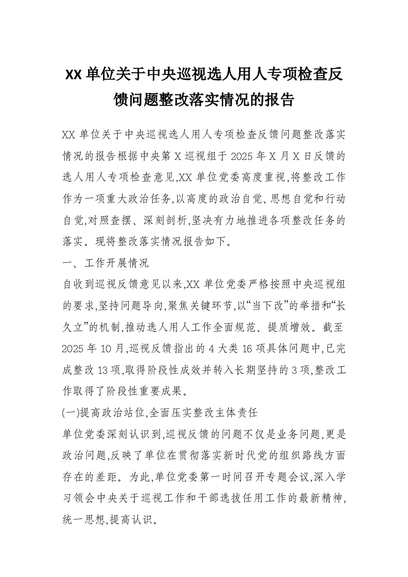 XX单位关于中央巡视选人用人专项检查反馈问题整改落实情况的报告