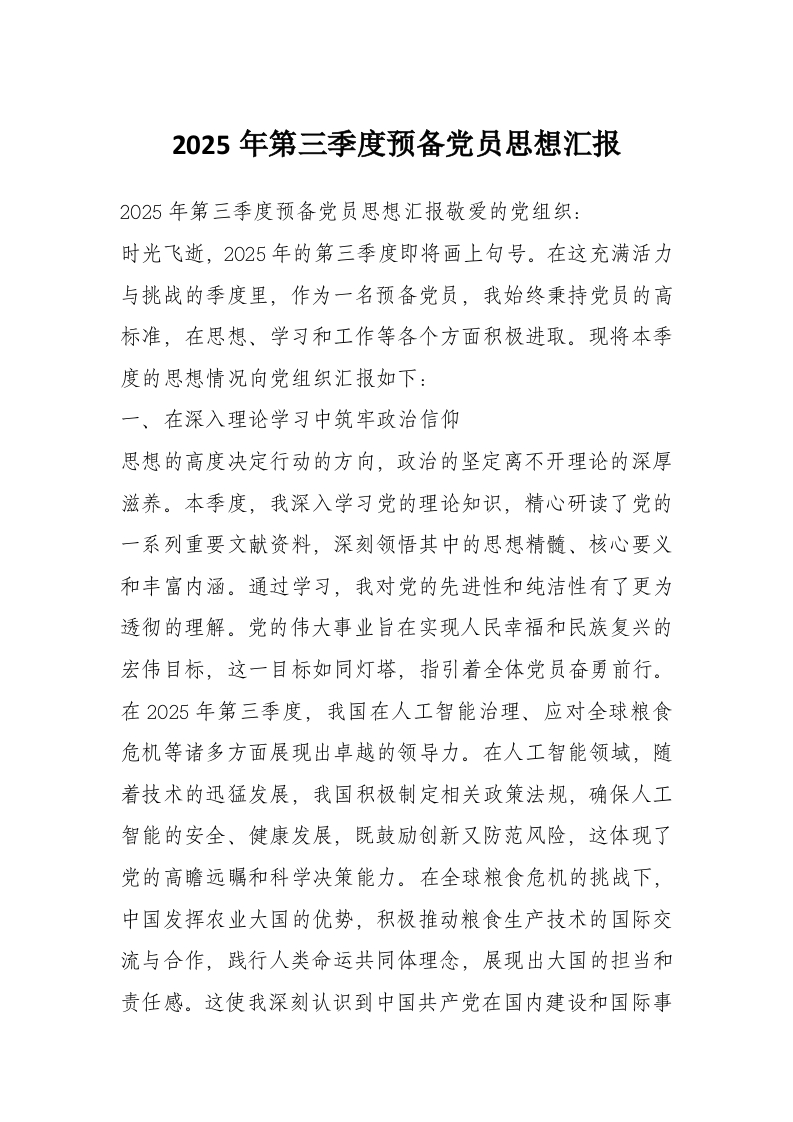 2025年第三季度预备党员思想汇报