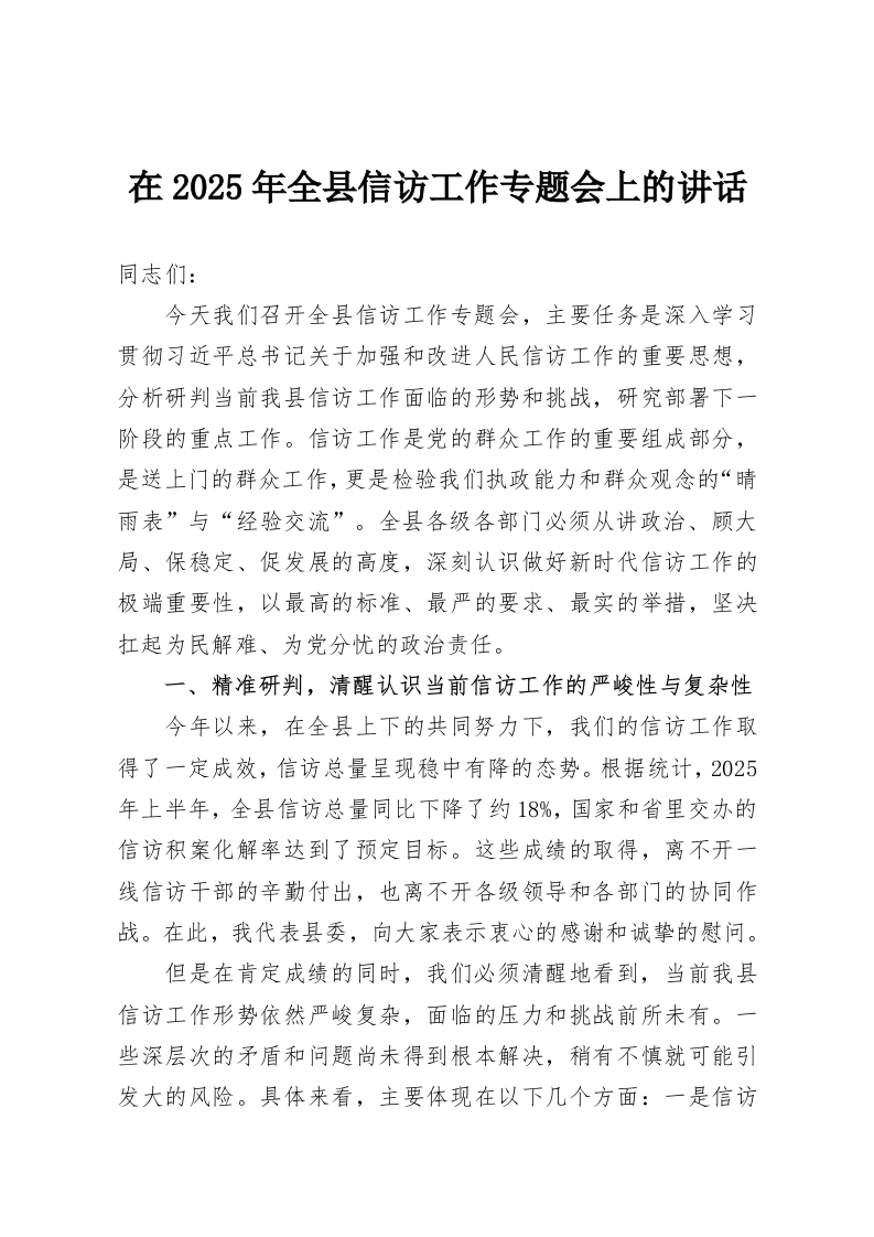 首页写作素材在2025年全县信访工作专题会上的讲话