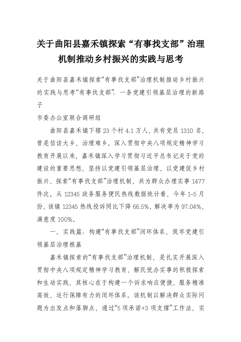 关于曲阳县嘉禾镇探索“有事找支部”治理机制推动乡村振兴的实践与思考