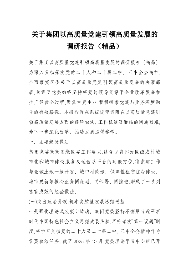 关于集团以高质量党建引领高质量发展的调研报告(精品)