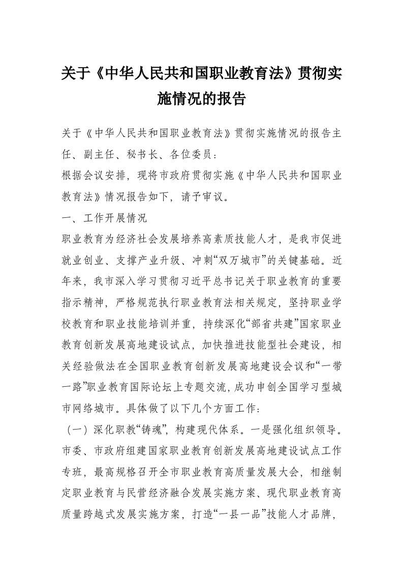 关于《中华人民共和国职业教育法》贯彻实施情况的报告