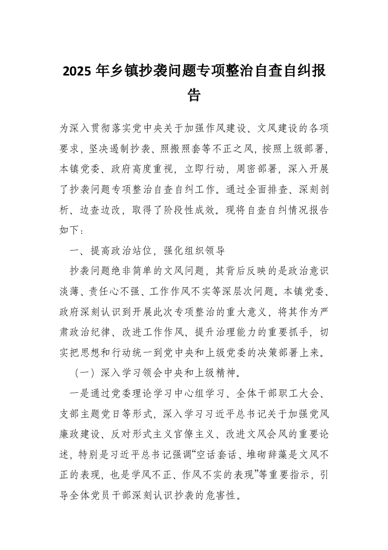 2025年乡镇公文抄袭问题专项整治自查自纠报告