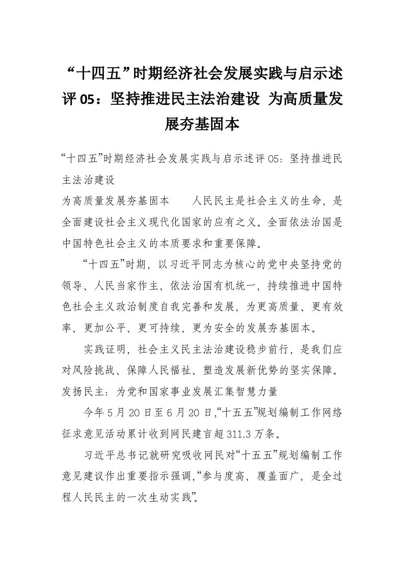 首页工作文档“十四五”时期经济社会发展实践与启示述评05:坚持推进民主法治建设 为高质量发展夯基固本