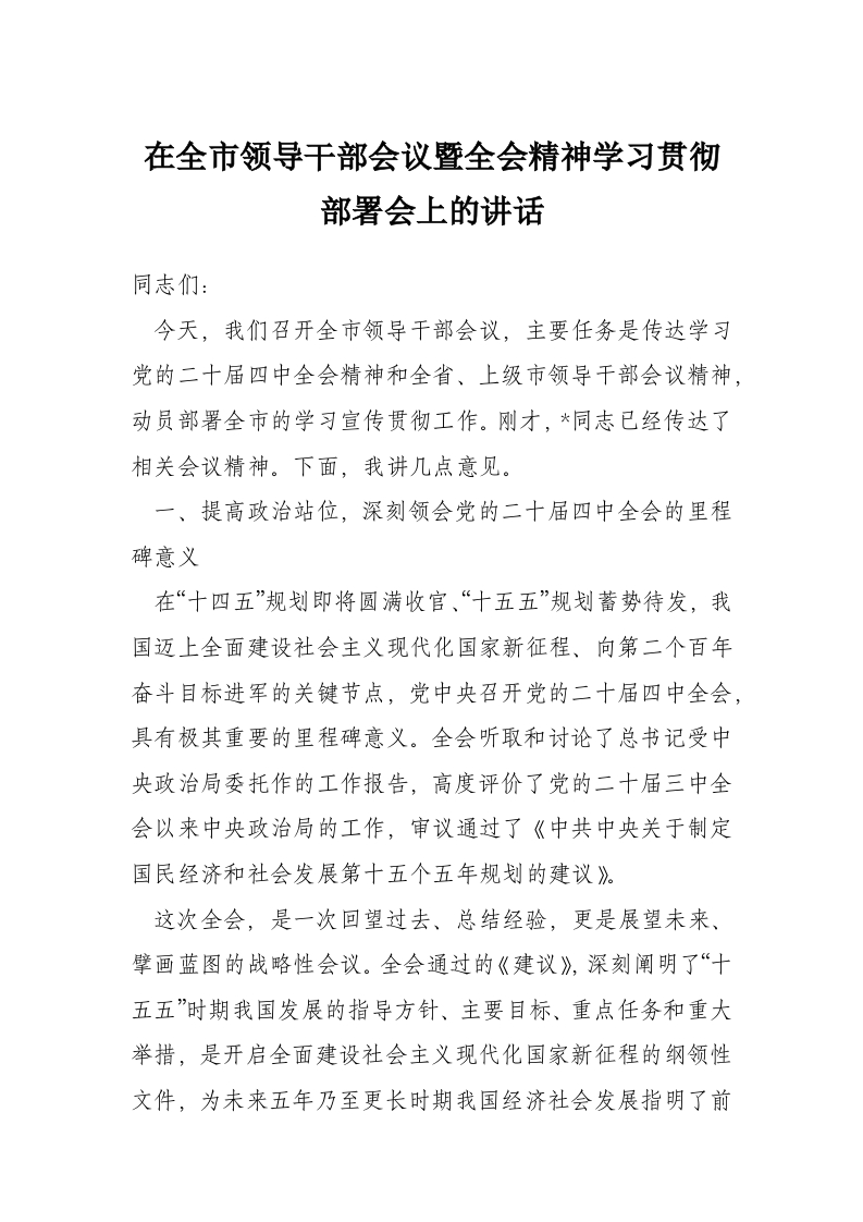 在全市领导干部会议暨***精神学习贯彻部署会上的讲话