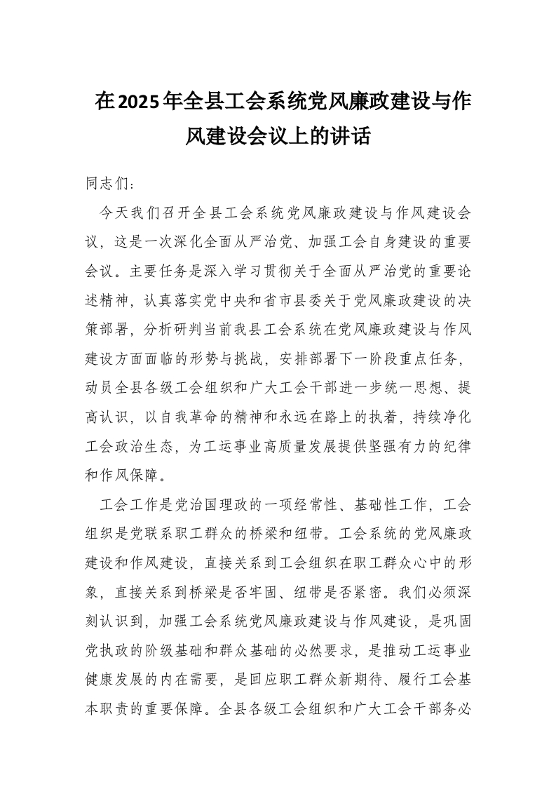 在2025年全县工会系统党风廉政建设与作风建设会议上的讲话