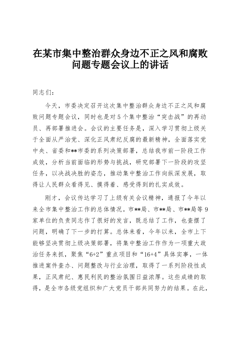 在某市集中整治群众身边不正之风和腐败问题专题会议上的讲话