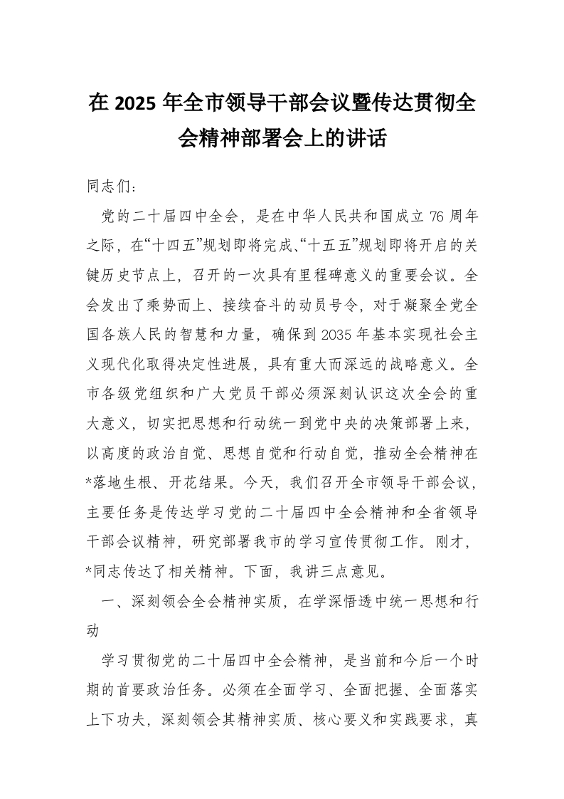 在2025年全市领导干部会议暨传达贯彻***精神部署会上的讲话