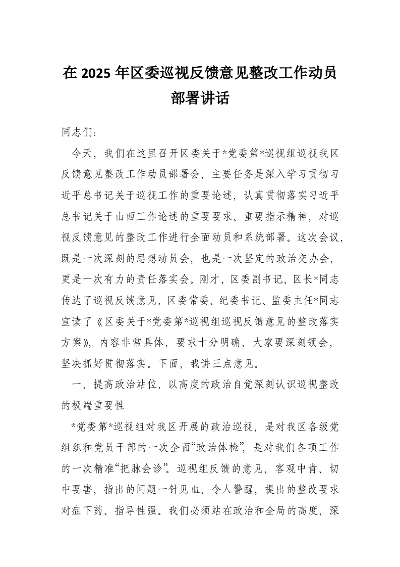 在2025年区委巡视反馈意见整改工作动员部署讲话