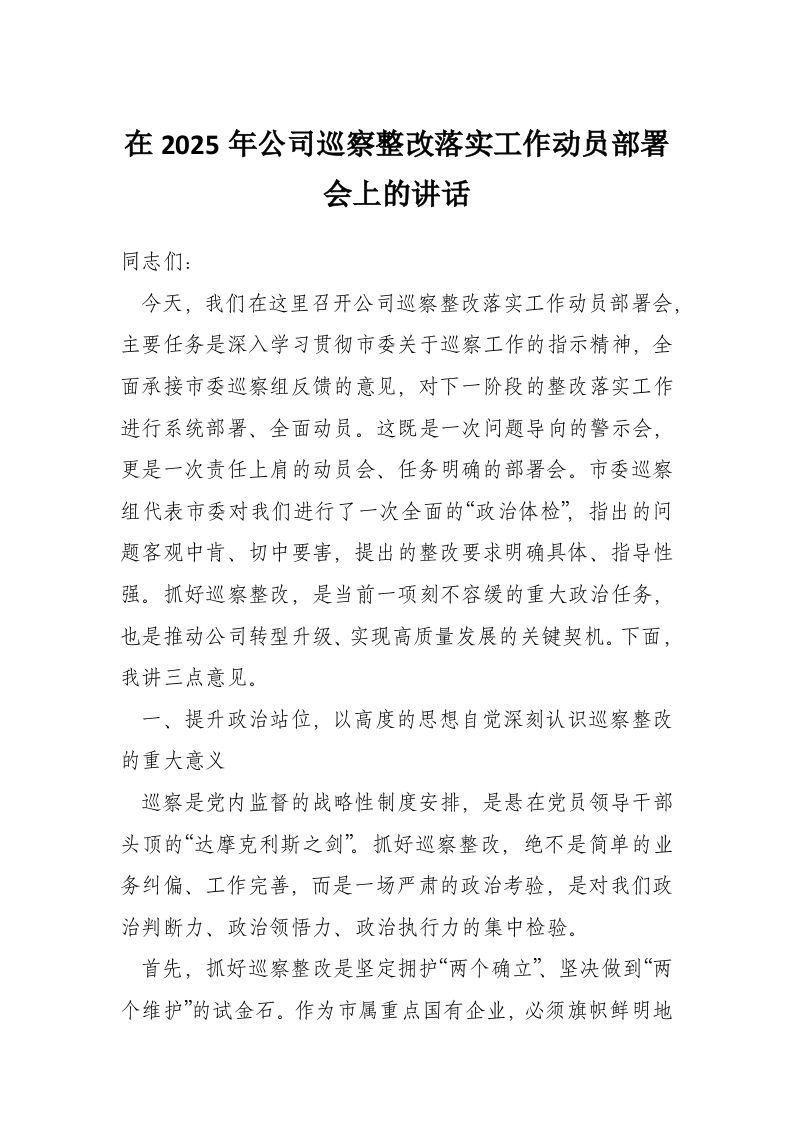 在2025年公司巡察整改落实工作动员部署会上的讲话