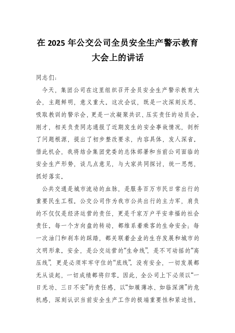 在2025年公交公司全员安全生产警示教育大会上的讲话