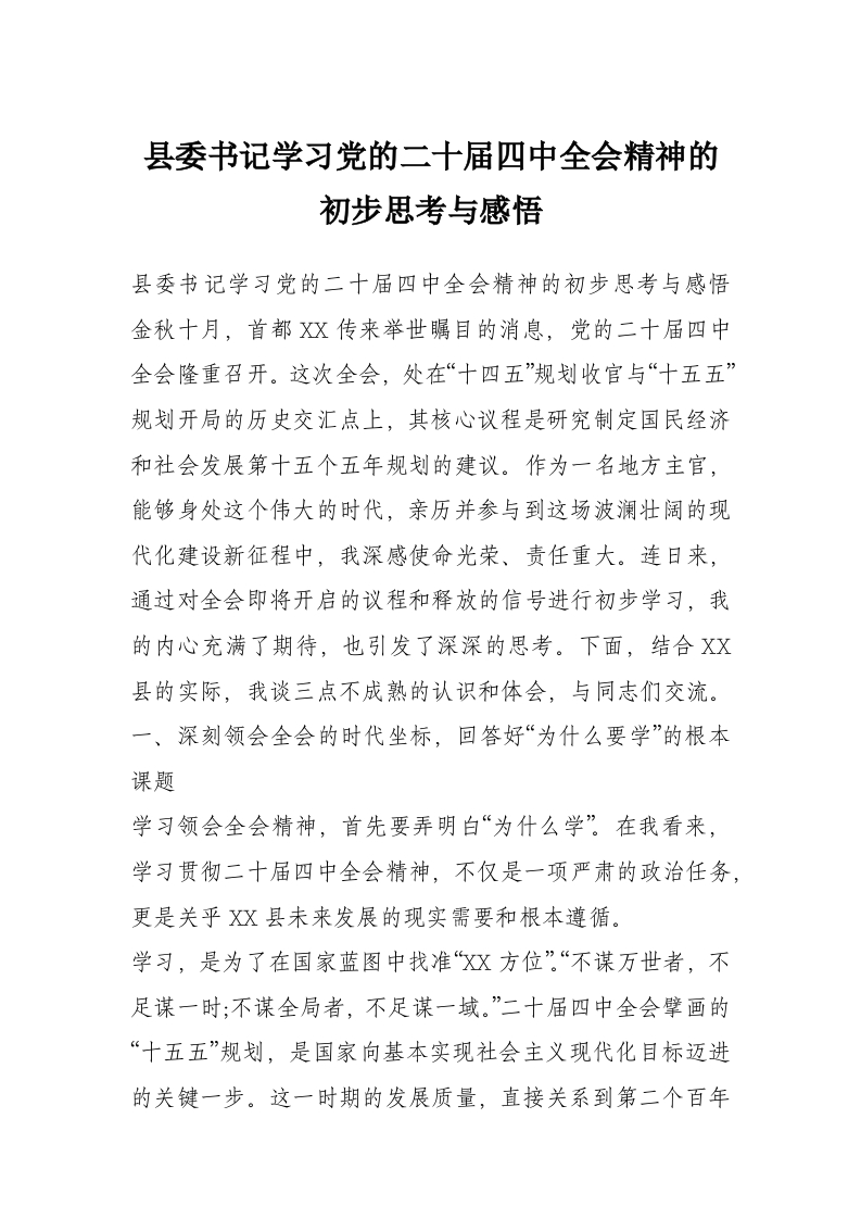 县委书记学习党的二十届四中***精神的初步思考与感悟