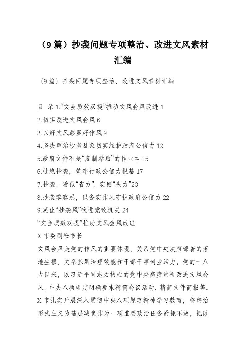 (9篇)公文抄袭问题专项整治、改进文风素材汇编