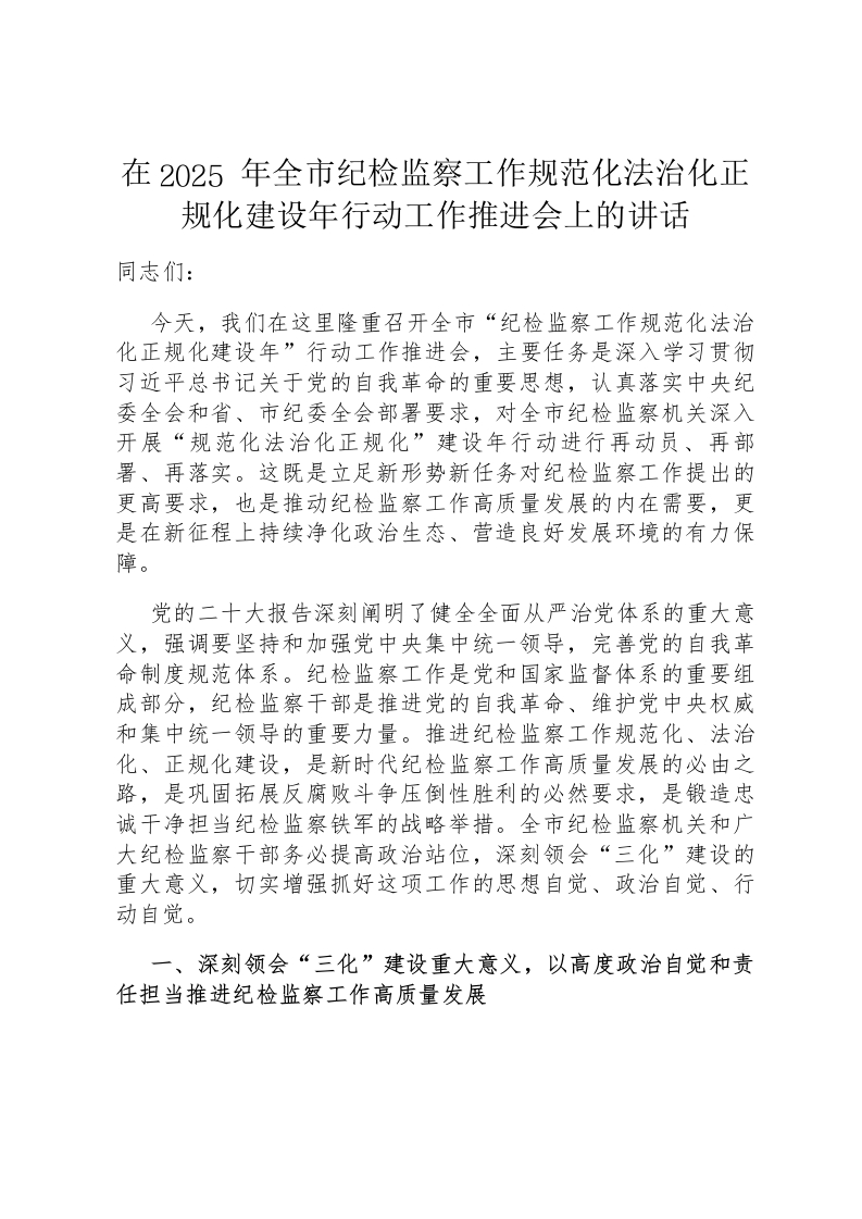 在2025年全市纪检监察工作规范化法治化正规化建设年行动工作推进会上的讲话