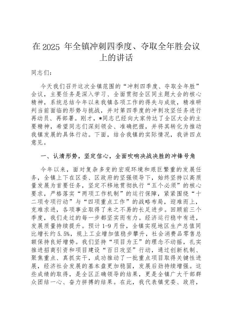 在2025年全镇冲刺四季度、夺取全年胜会议上的讲话