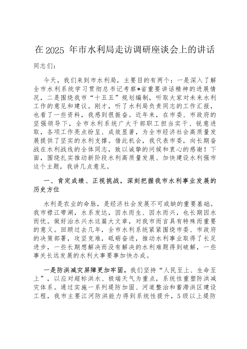在2025年市水利局走访调研座谈会上的讲话