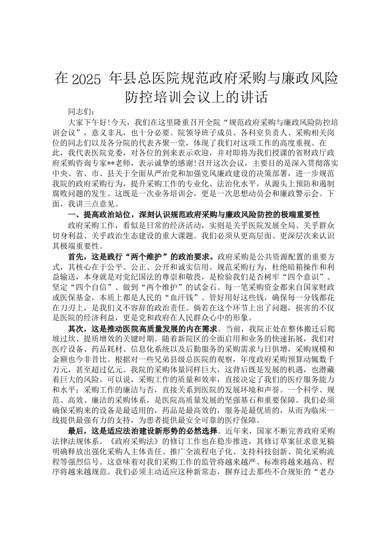 在2025年县总医院规范***采购与廉政风险防控培训会议上的讲话