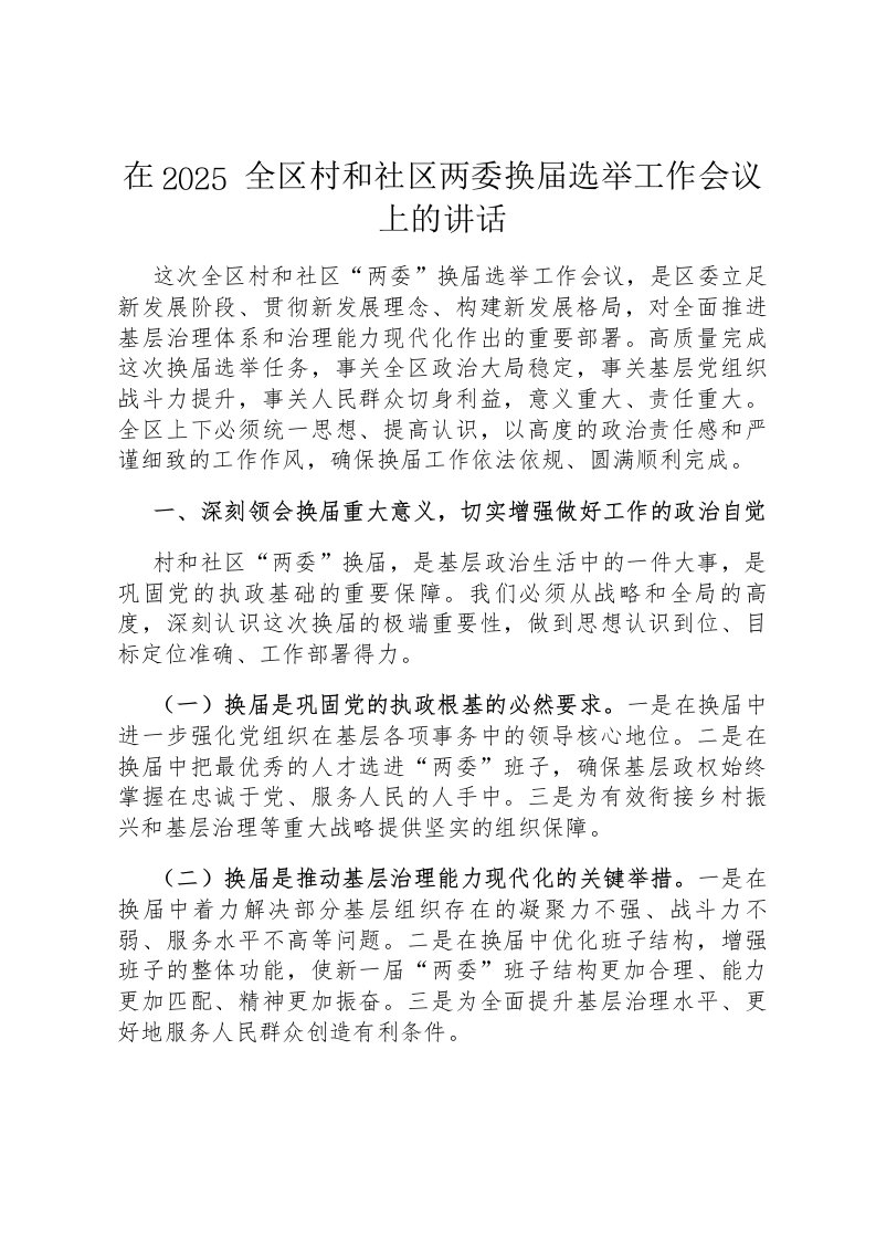 在2025全区村和社区两委换届选举工作会议上的讲话