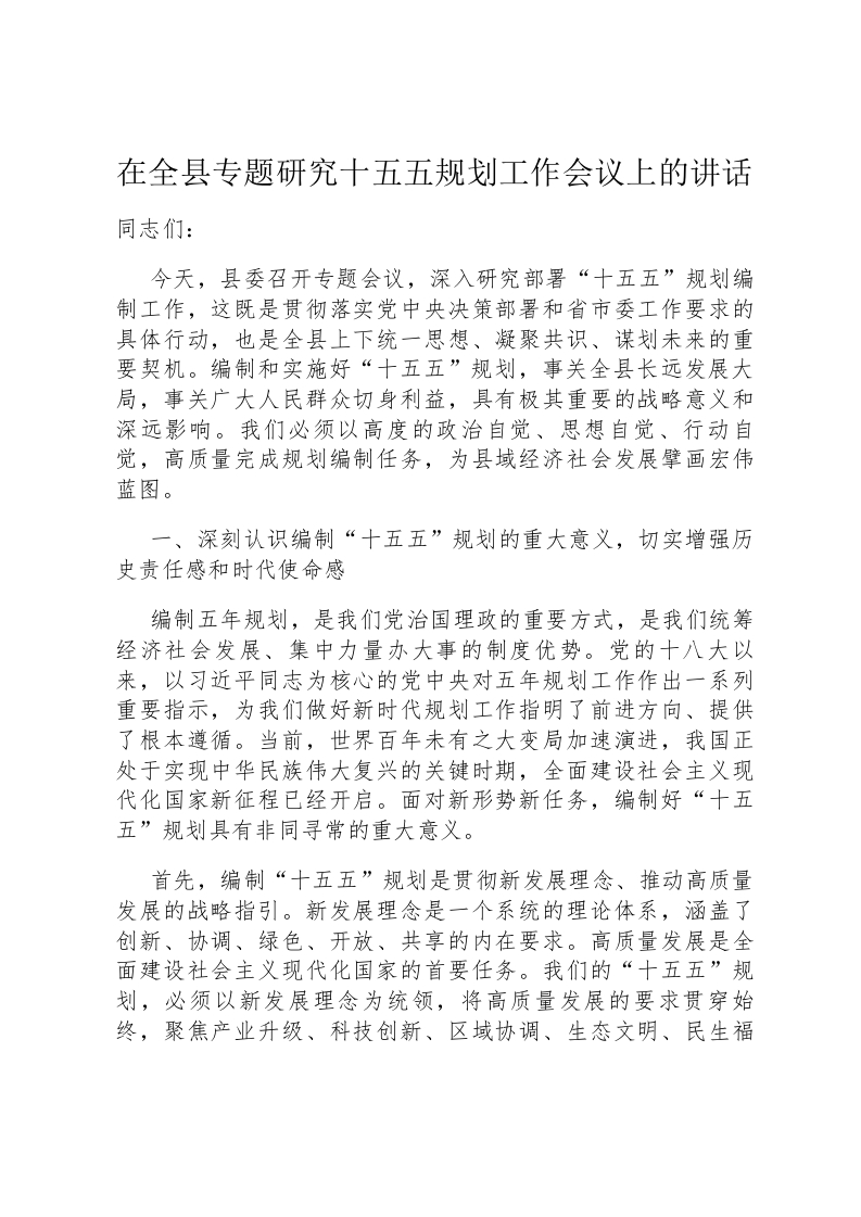 在全县专题研究十五五规划工作会议上的讲话