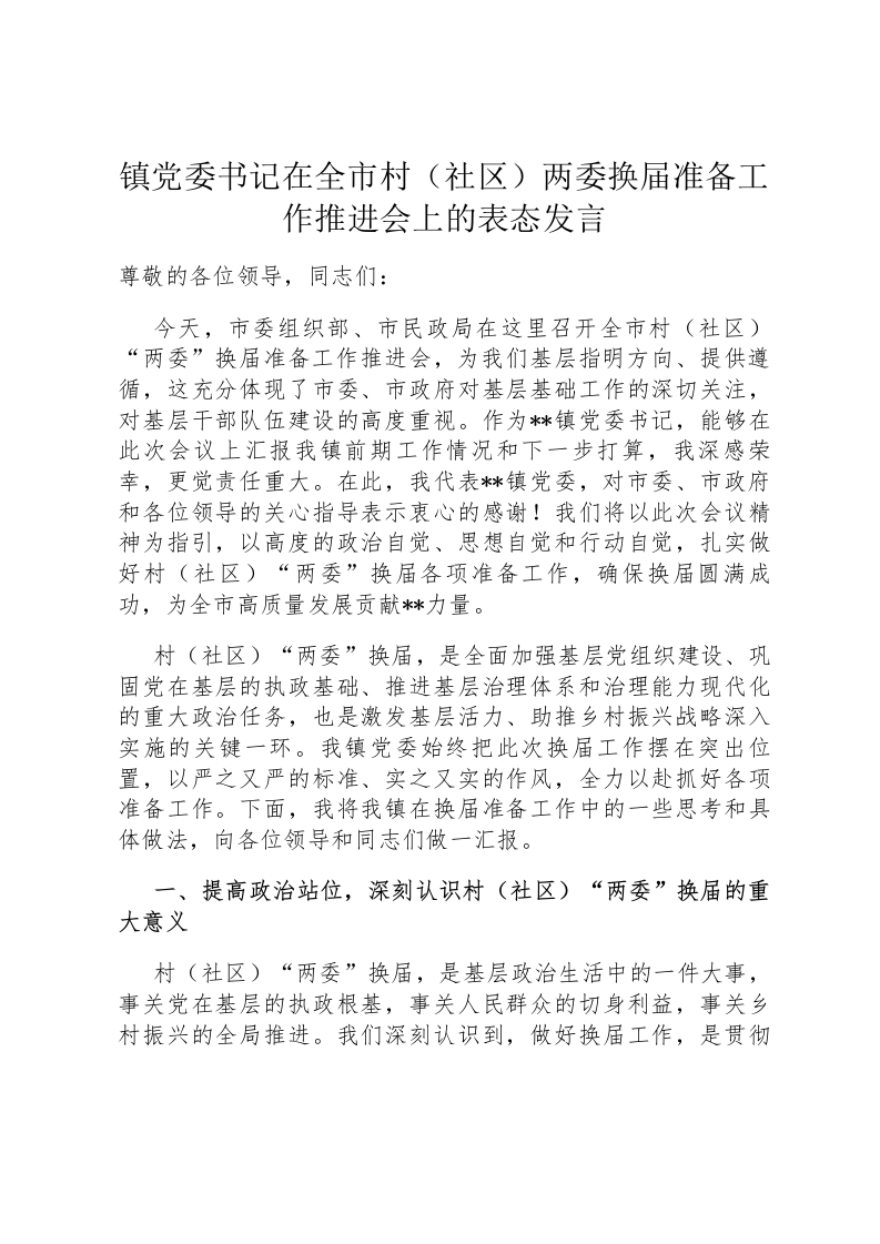 镇党委书记在全市村(社区)两委换届准备工作推进会上的表态发言