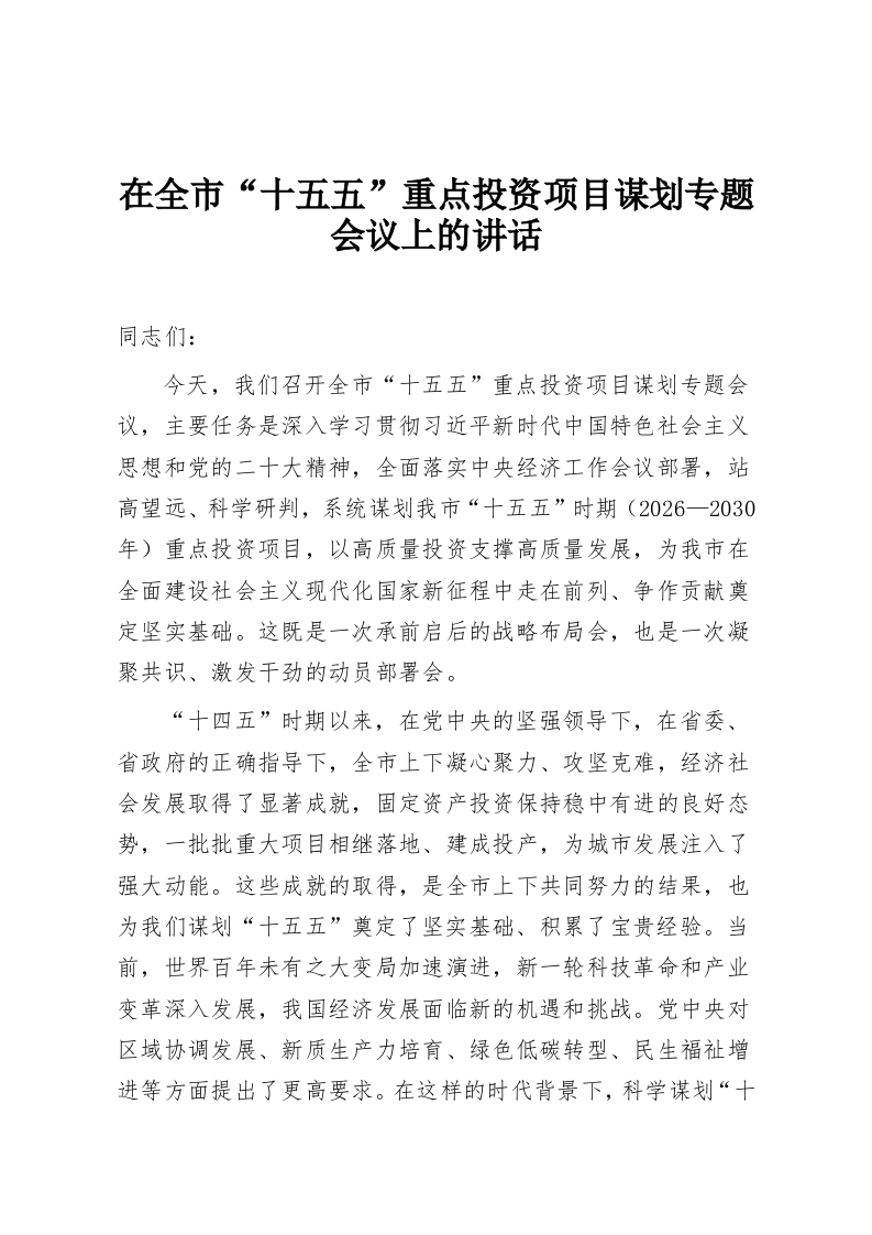 在全市“十五五”重点投资项目谋划专题会议上的讲话