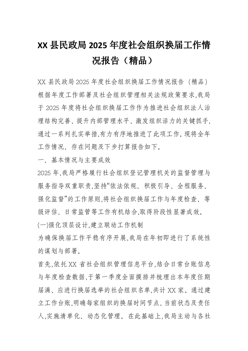 XX县民政局2025年度社会组织换届工作情况报告(精品)