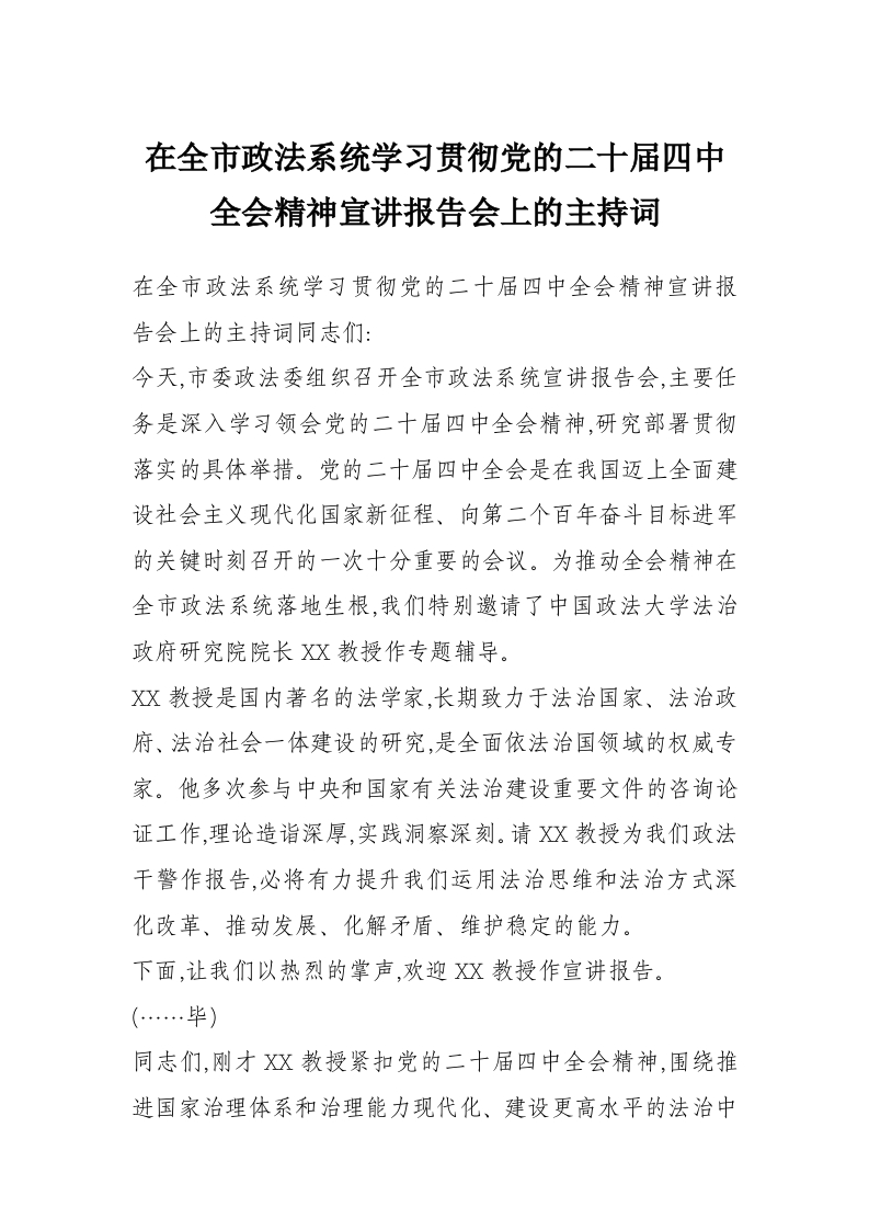 在全市政法系统学习贯彻党的二十届四中***精神宣讲报告会上的主持词