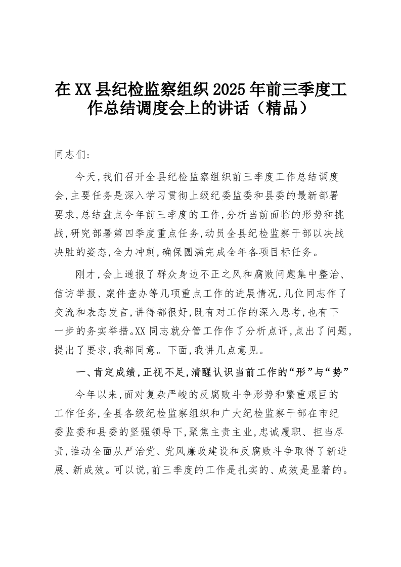 在XX县纪检监察组织2025年前三季度工作总结调度会上的讲话(精品)