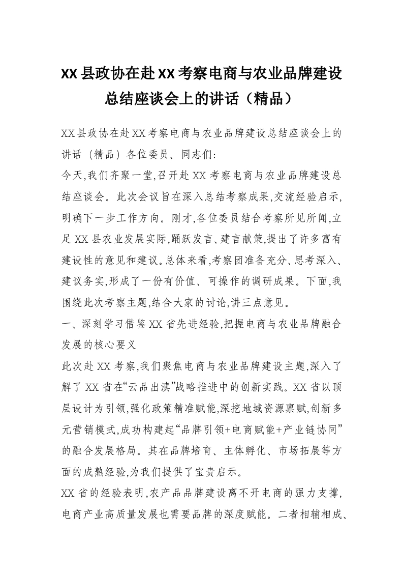 XX县政协在赴XX考察电商与农业品牌建设总结座谈会上的讲话(精品)