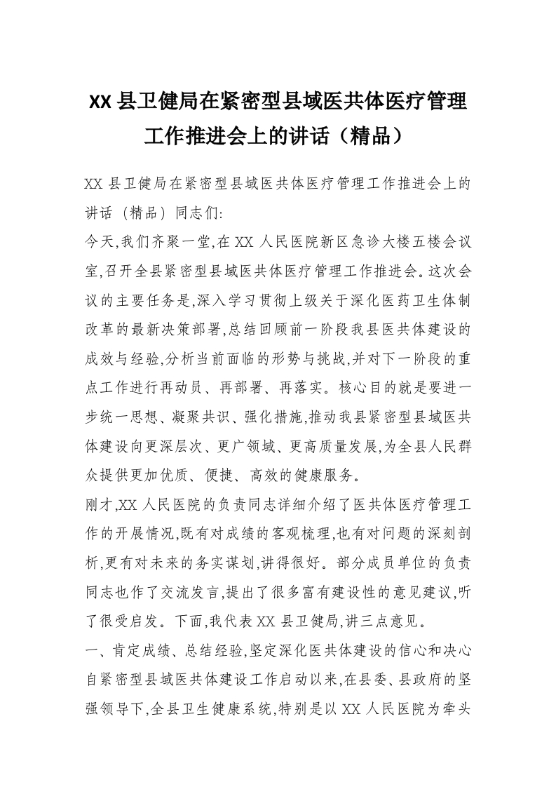 XX县卫健局在紧密型县域医共体医疗管理工作推进会上的讲话(精品)