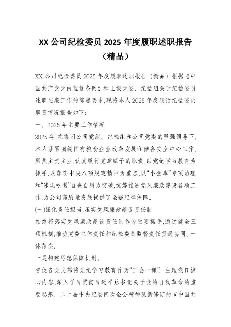 首页写作素材XX公司纪检委员2025年度履职述职报告(精品)