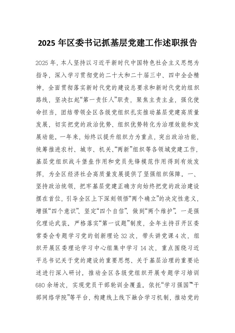 首页写作素材2025年区委书记抓基层党建工作述职报告