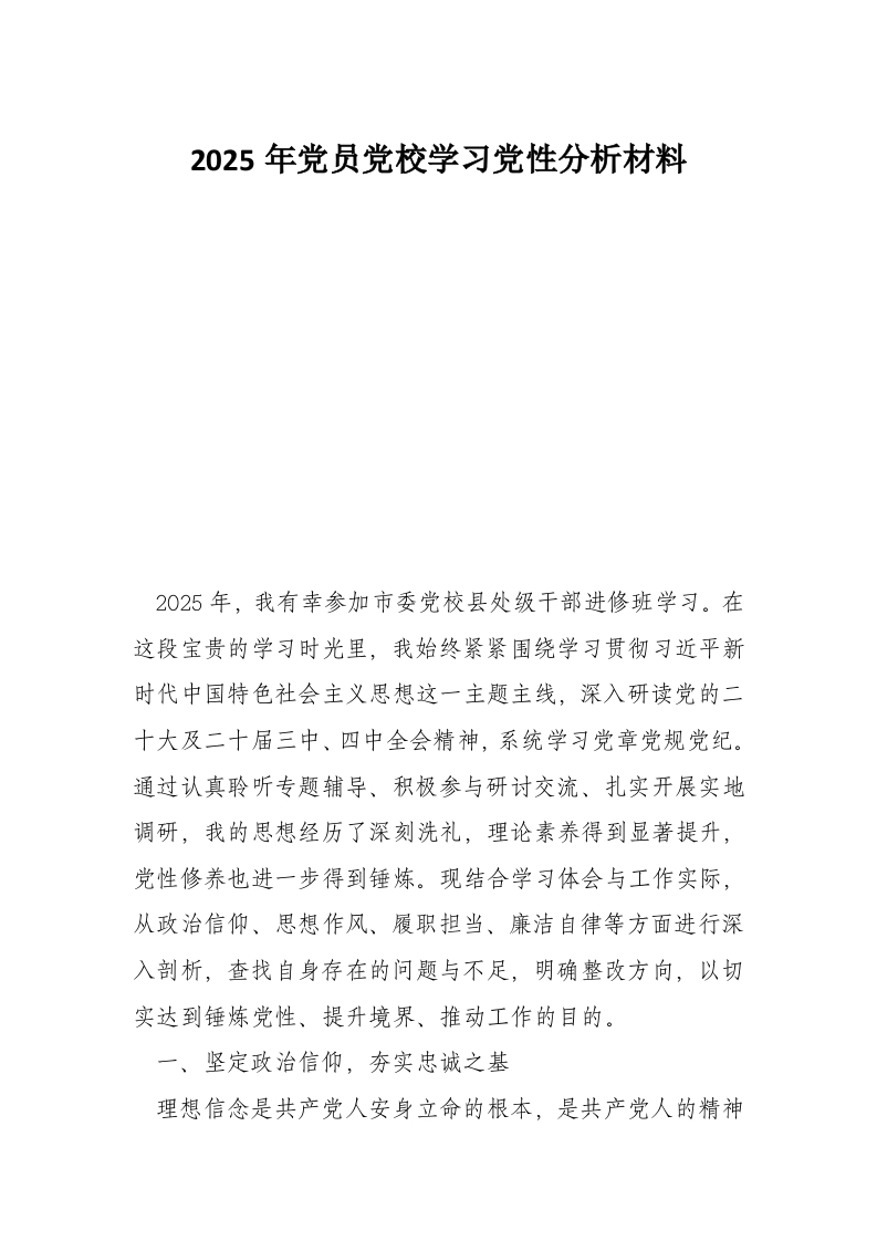 2025年党员党校学习党性分析材料